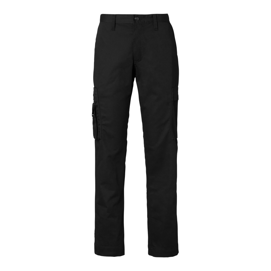 Midjebyxa med två insydda framfickor. Två förstärkta bakfickor med lock och dolda tryckknappar. Två benfickor med dold dragkedja. Den högra är utrustad med stor extraficka, telefonficka och pennfack.