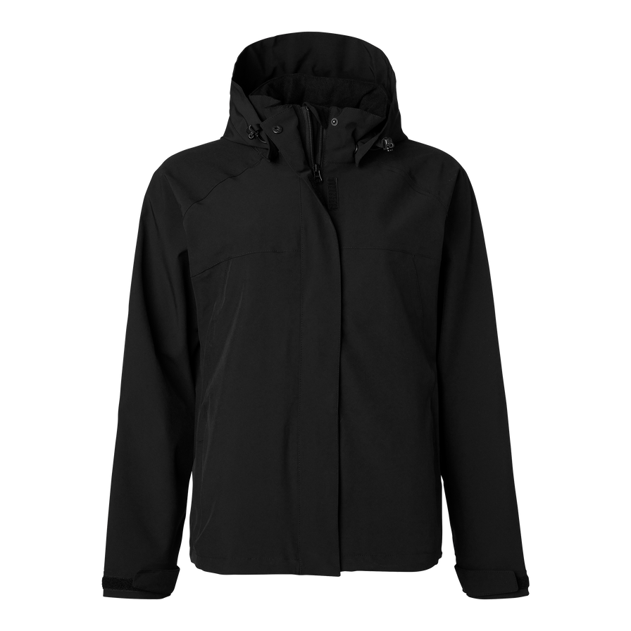 Figursydd allvädersjacka dam med tejpade sömmar. Hel dragkedja med kedjeskydd och vindslå. Två framfickor med dragkedja. Invändig napoleonficka. Ok med ventilation i rygg. Dragsko i nederkant och reglerbart ärmslut med kardborre. Reglerbar löstagbar huva. Vattenpelare 5000mm. Andningsförmåga 3000g/m².