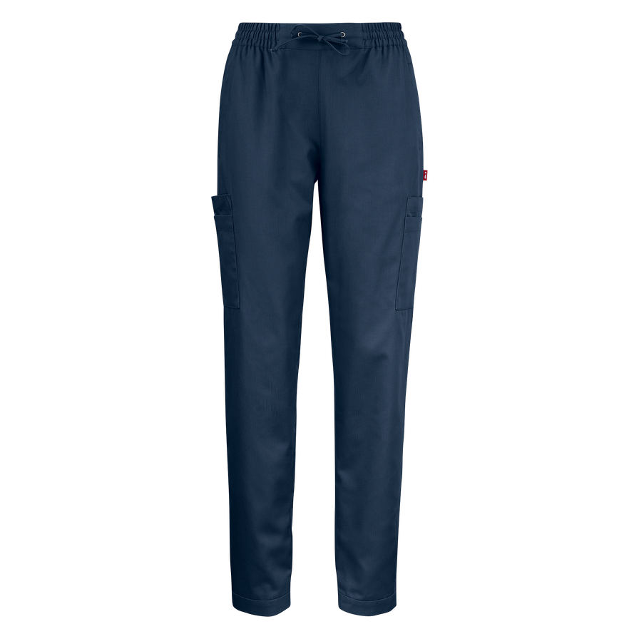 Smidig byxa i unisexmodell. Resår och dragsko i midjan. Rymliga passpoalfickor fram och dubbla benfickor på båda benen. Pennficka på höger ben. Benslutet bak har en resår som gör att byxan drar ihop sig något. Innerbenslängd 84 cm i storlek M.